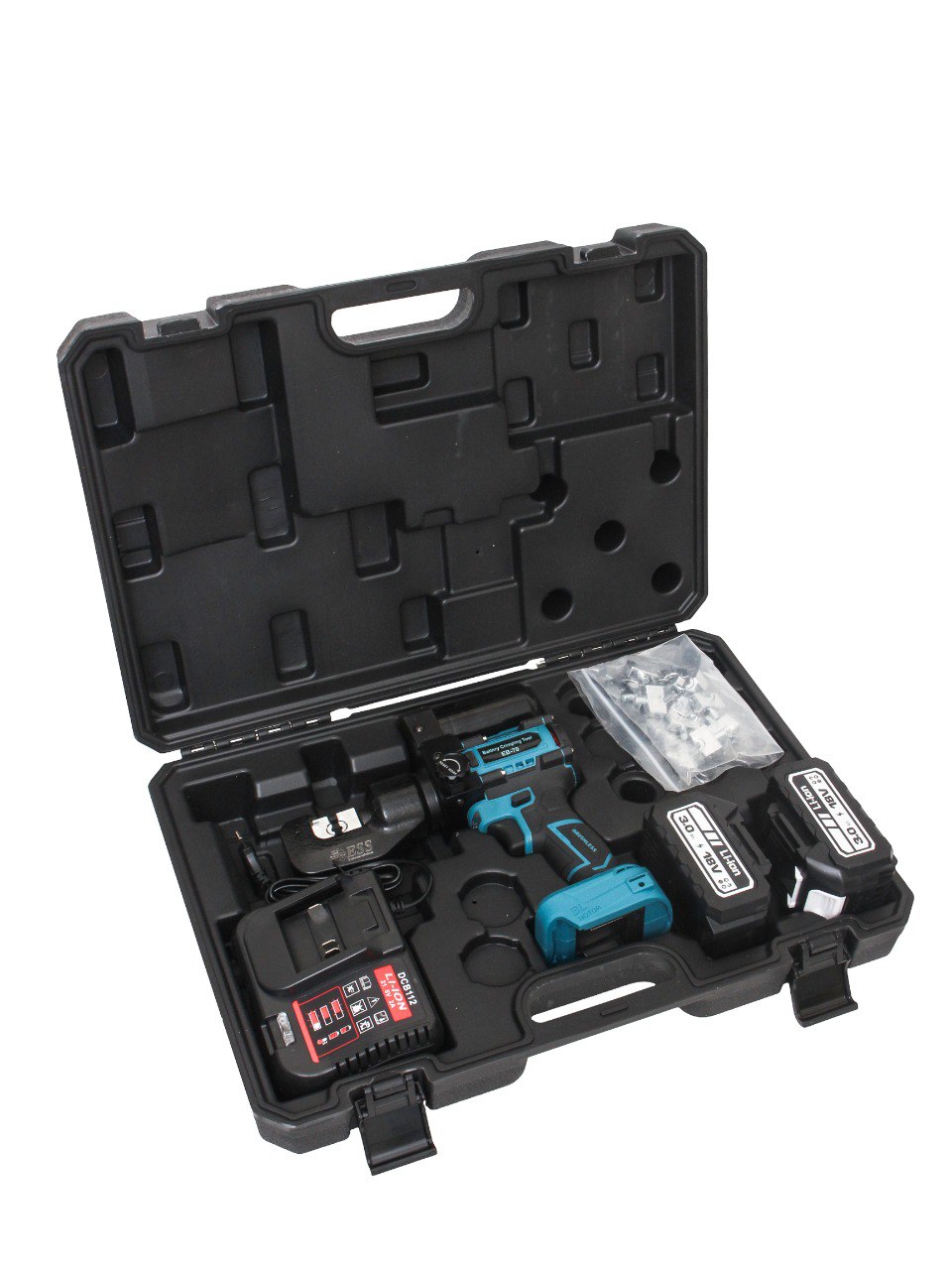 Инструмент поставляется в удобном и ударопрочном кейсе вместе с набором матриц, двумя аккумуляторами и зарядным устройством. Такой комплект полностью готов к работе и идеально подходит для профессиональных электриков и монтажников.