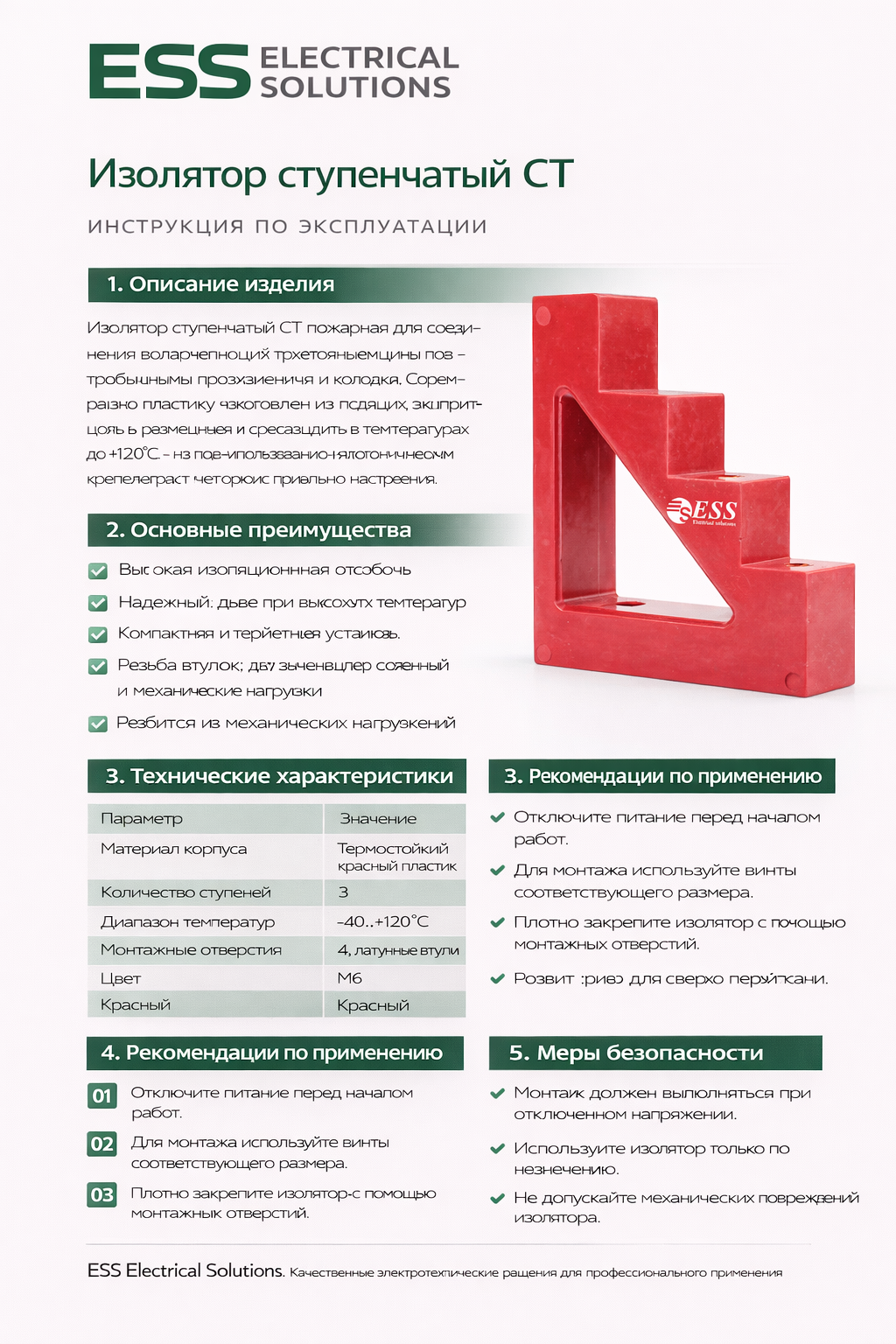Ступенчатые изоляторы предназначены для жесткого крепления и изоляции токопроводящих шин внутри электрических щитов, шинных мостов и другого оборудования. Изоляторы могут быть использованы в электрооборудовании постоянного и переменного тока частотой 50 Гц и напряжением до 1000 В, и гарантируют отсутствие пробоев между шинами. Корпус изоляторов изготовлен из особого, стойкого к механическому воздействию, негорючего полимера, обладающего высокими показателями электрического сопротивления.