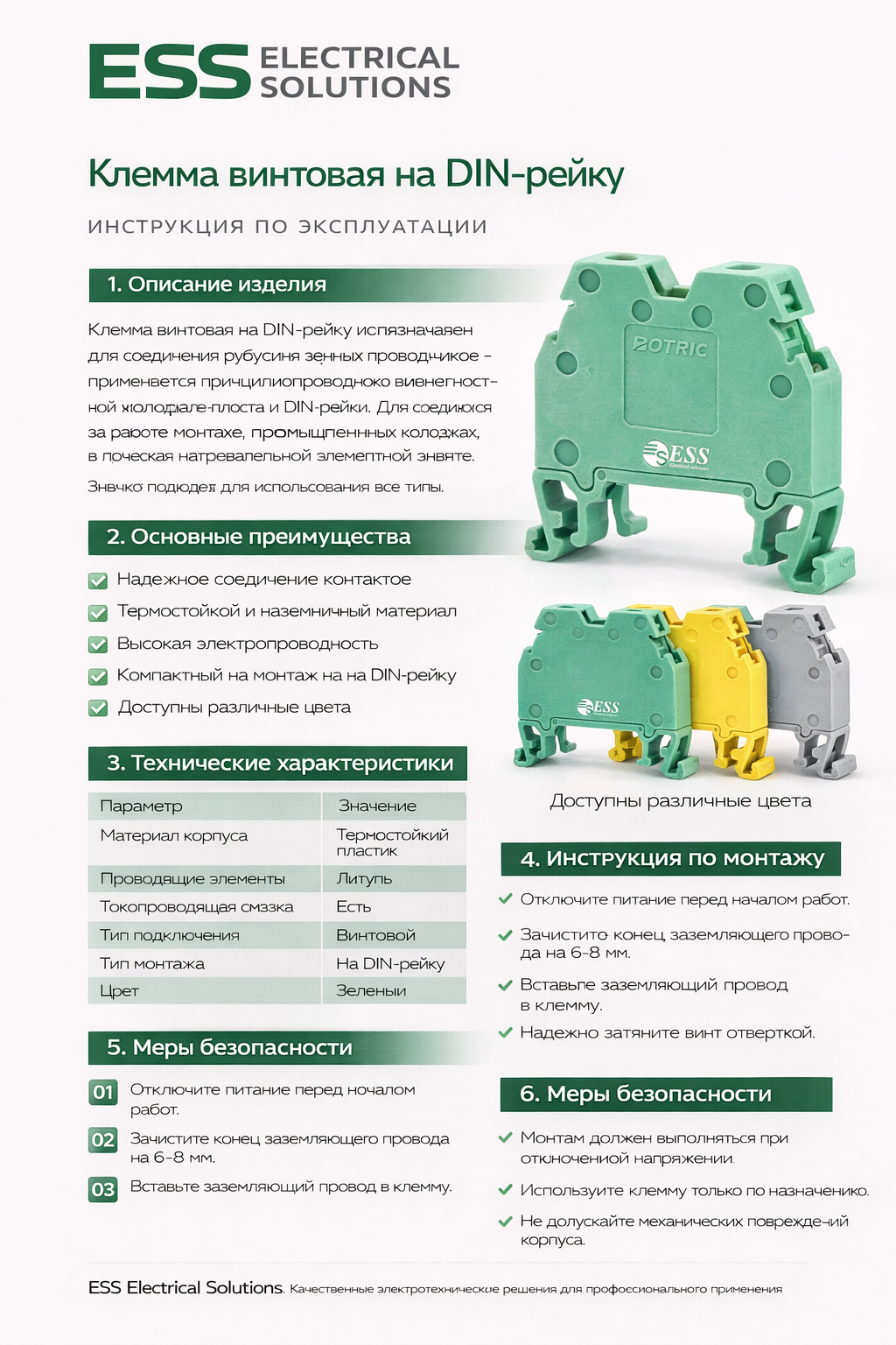 Винтовой зажим гарантирует прочную фиксацию проводов, предотвращая их ослабление в процессе эксплуатации. Корпус выполнен из качественного изоляционного материала, устойчивого к нагреву, механическим нагрузкам и длительной работе в электроустановках. Конструкция клеммы обеспечивает удобный доступ при монтаже и обслуживании, что значительно ускоряет сборку щита.