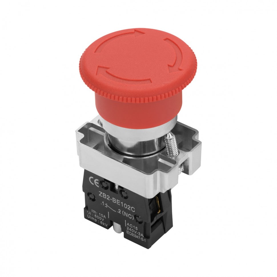 Конструкция кнопки предусматривает поворотный механизм возврата, исключающий случайное включение. Корпус выполнен из ударопрочного пластика и металла, обеспечивающего долговечность и устойчивость к механическим повреждениям.