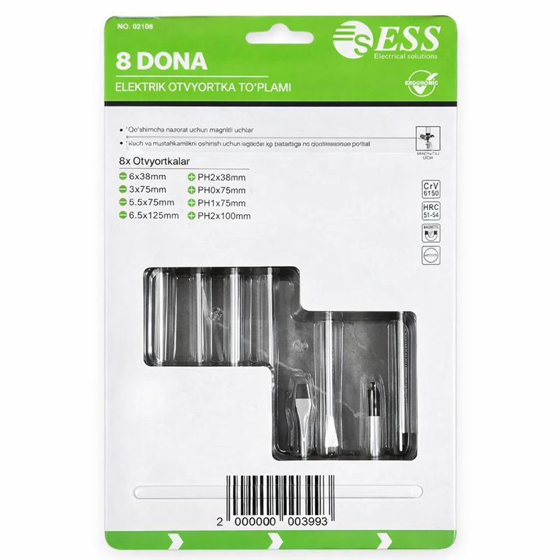 Набор электрических отверток ESS (8 штук) предназначен для безопасных и удобных работ с электрическими соединениями. Отвертки изготовлены из прочной хром-ванадиевой стали и оснащены диэлектрическими рукоятками, обеспечивающими защиту при работе с электрооборудованием.