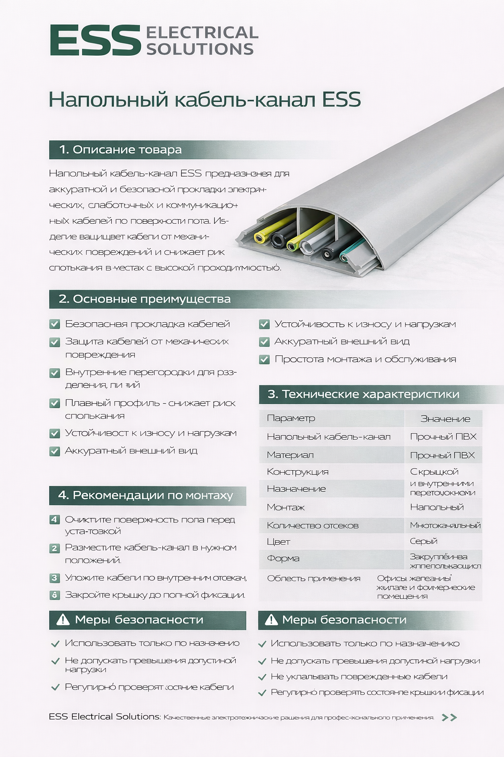 Надежный кабель-канал напольный с разделителями фирмы-производителя ESS предназначается для наружного монтажа кабелей, проводов и линий связи внутри помещений, в которых имеет место постоянная перестановка оборудования и рабочих мест, невозможно представить без данного решения подвода информационных и силовых линий. Также используется для подвода питания к колоннам или мини-колоннам. Канал гарантирует защиту электропроводов от всевозможных воздействий, при коротком замыкании снижается до минимума вероятность возникновения пожара. Крепится к поверхности через перфорированное дно. Конструктивно изделие состоит из следующих частей: корпуса канала и одной крышки, которая соединяется с корпусом при помощи замка - защелкивается. Имеет размер 50х13