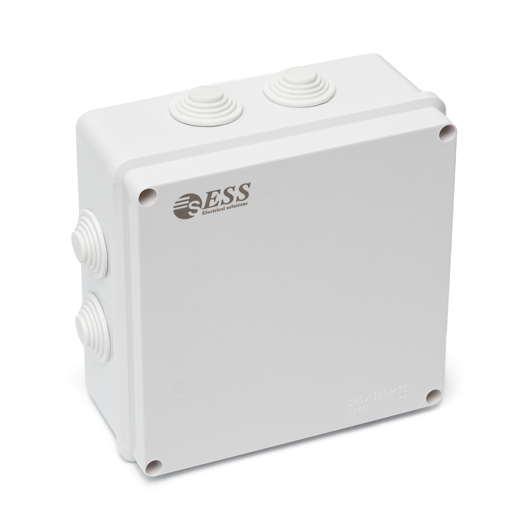 Квадратная распределительная коробка открытой установки, с защелкивающейся крышкой. С шестью большими ступенчатыми сальниками для ввода кабелей и гофротруб.  Имеются колпачки для колец, защищающие крепежные винты. Материал коробки выдерживает испытания раскаленной проволокой до +750 °C. Отвечает всем требованиям безопасности. Запатентованная конструкция сальников, механизма защелкивания крышки гарантирует защиту степенью IP 44