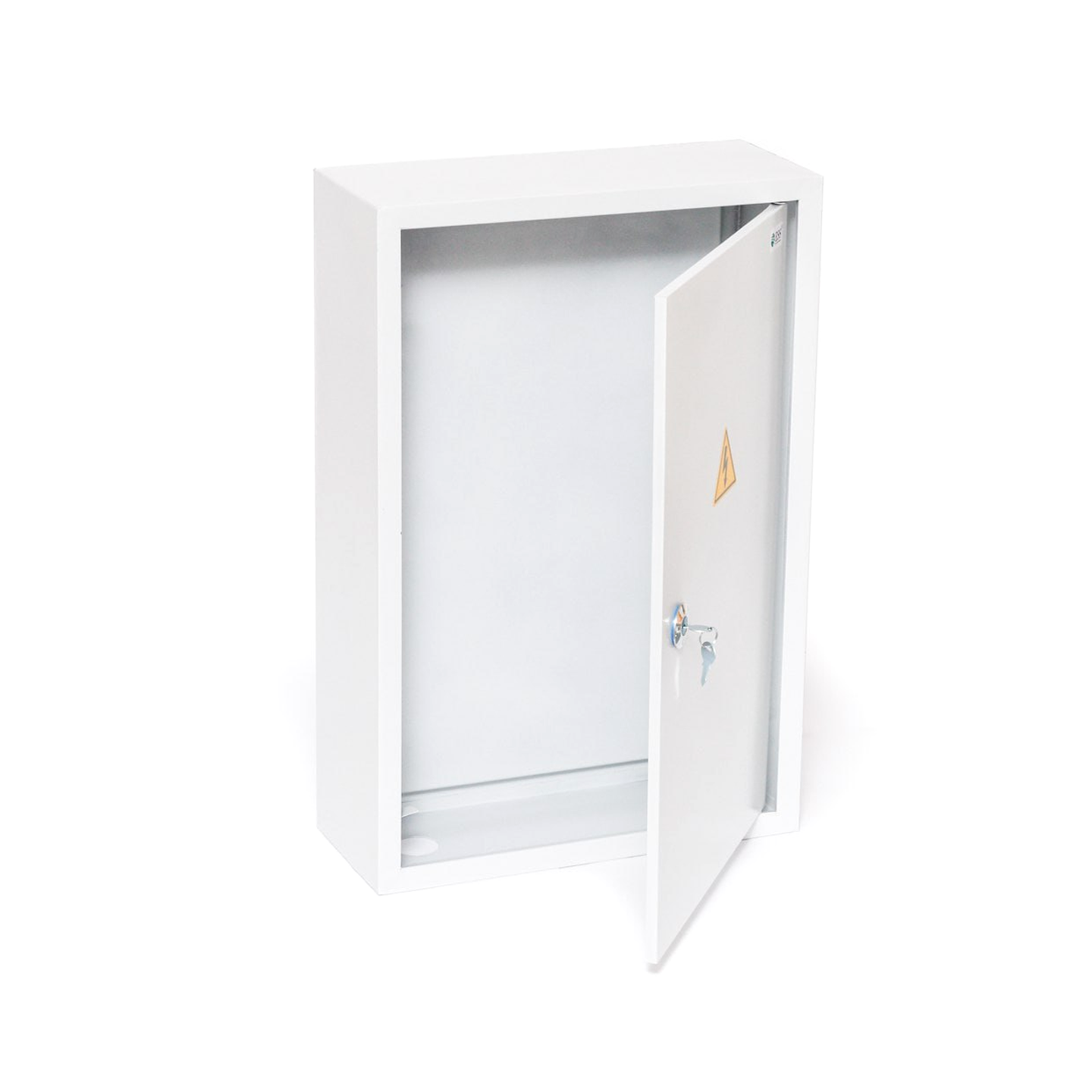 Щит с монтажной панелью представляет собой металлический каркас, имеющий отверстия на нижней панели корпуса для заведения кабеля и на задней стенке для удобного крепления к вертикальной поверхности. Комплектация включает съемную монтажную панель для более легкого крепления модулей и дверцу со встроенным, запирающимся на ключ замком, для защиты внутреннего оснащения.