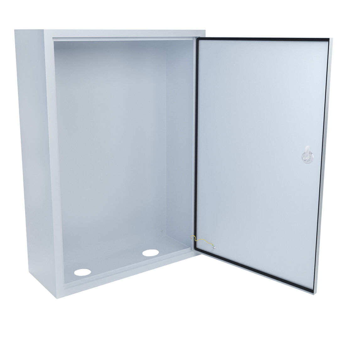 Щит с монтажной панелью представляет собой металлический каркас, имеющий отверстия на нижней панели корпуса для заведения кабеля и на задней стенке для удобного крепления к вертикальной поверхности. Комплектация включает съемную монтажную панель для более легкого крепления модулей и дверцу со встроенным, запирающимся на ключ замком, для защиты внутреннего оснащения.