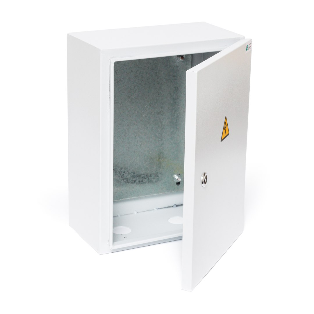 Щит с монтажной панелью представляет собой металлический каркас, имеющий отверстия на нижней панели корпуса для заведения кабеля и на задней стенке для удобного крепления к вертикальной поверхности. Комплектация включает съемную монтажную панель для более легкого крепления модулей и дверцу со встроенным, запирающимся на ключ замком, для защиты внутреннего оснащения.