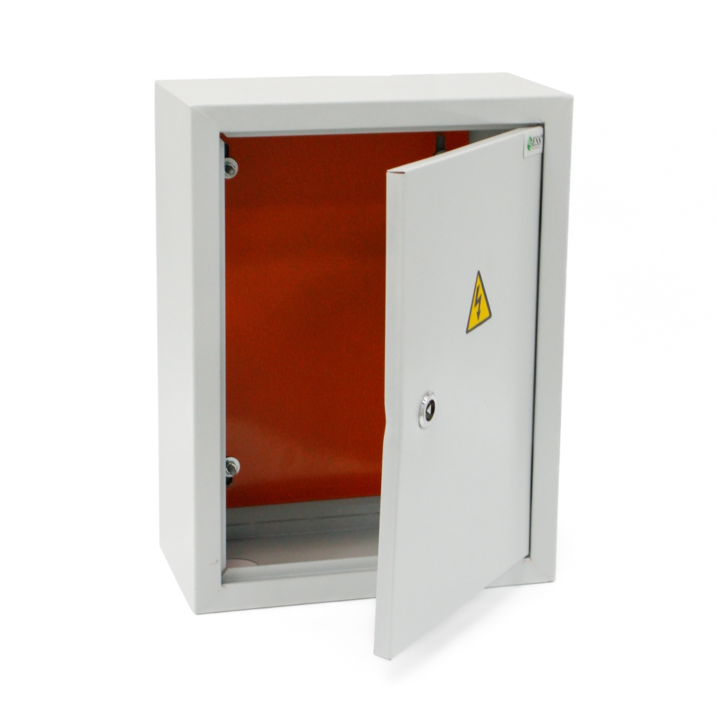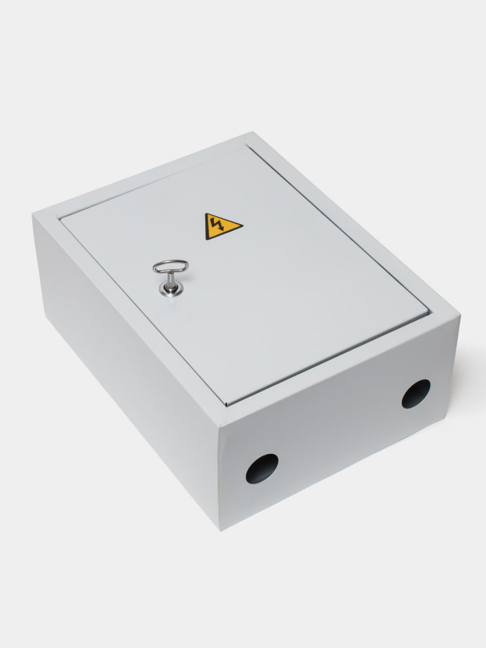 Щит с монтажной панелью представляет собой металлический каркас, имеющий отверстия на нижней панели корпуса для заведения кабеля и на задней стенке для удобного крепления к вертикальной поверхности. Комплектация включает съемную монтажную панель для более легкого крепления модулей и дверцу со встроенным, запирающимся на ключ замком, для защиты внутреннего оснащения.
