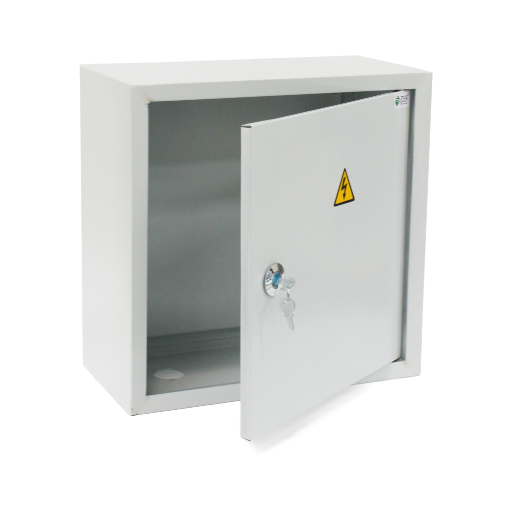 Щит с монтажной панелью представляет собой металлический каркас, имеющий отверстия на нижней панели корпуса для заведения кабеля и на задней стенке для удобного крепления к вертикальной поверхности. Комплектация включает съемную монтажную панель для более легкого крепления модулей и дверцу со встроенным, запирающимся на ключ замком, для защиты внутреннего оснащения.