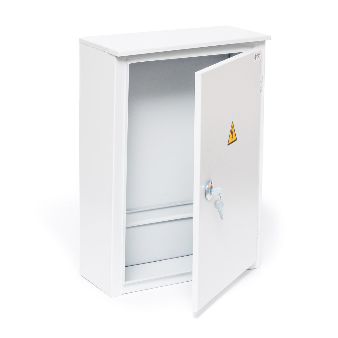 Щит с монтажной панелью представляет собой металлический каркас, имеющий отверстия на нижней панели корпуса для заведения кабеля и на задней стенке для удобного крепления к вертикальной поверхности. Комплектация включает съемную монтажную панель для более легкого крепления модулей и дверцу со встроенным, запирающимся на ключ замком, для защиты внутреннего оснащения.