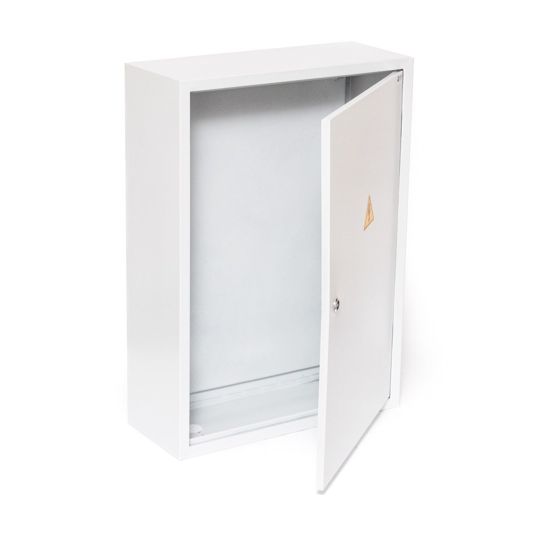 Щит с монтажной панелью представляет собой металлический каркас, имеющий отверстия на нижней панели корпуса для заведения кабеля и на задней стенке для удобного крепления к вертикальной поверхности. Комплектация включает съемную монтажную панель для более легкого крепления модулей и дверцу со встроенным, запирающимся на ключ замком, для защиты внутреннего оснащения.