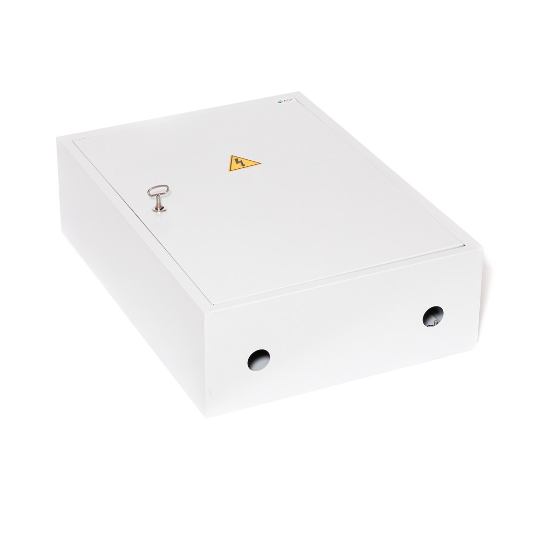 Щит с монтажной панелью представляет собой металлический каркас, имеющий отверстия на нижней панели корпуса для заведения кабеля и на задней стенке для удобного крепления к вертикальной поверхности. Комплектация включает съемную монтажную панель для более легкого крепления модулей и дверцу со встроенным, запирающимся на ключ замком, для защиты внутреннего оснащения.