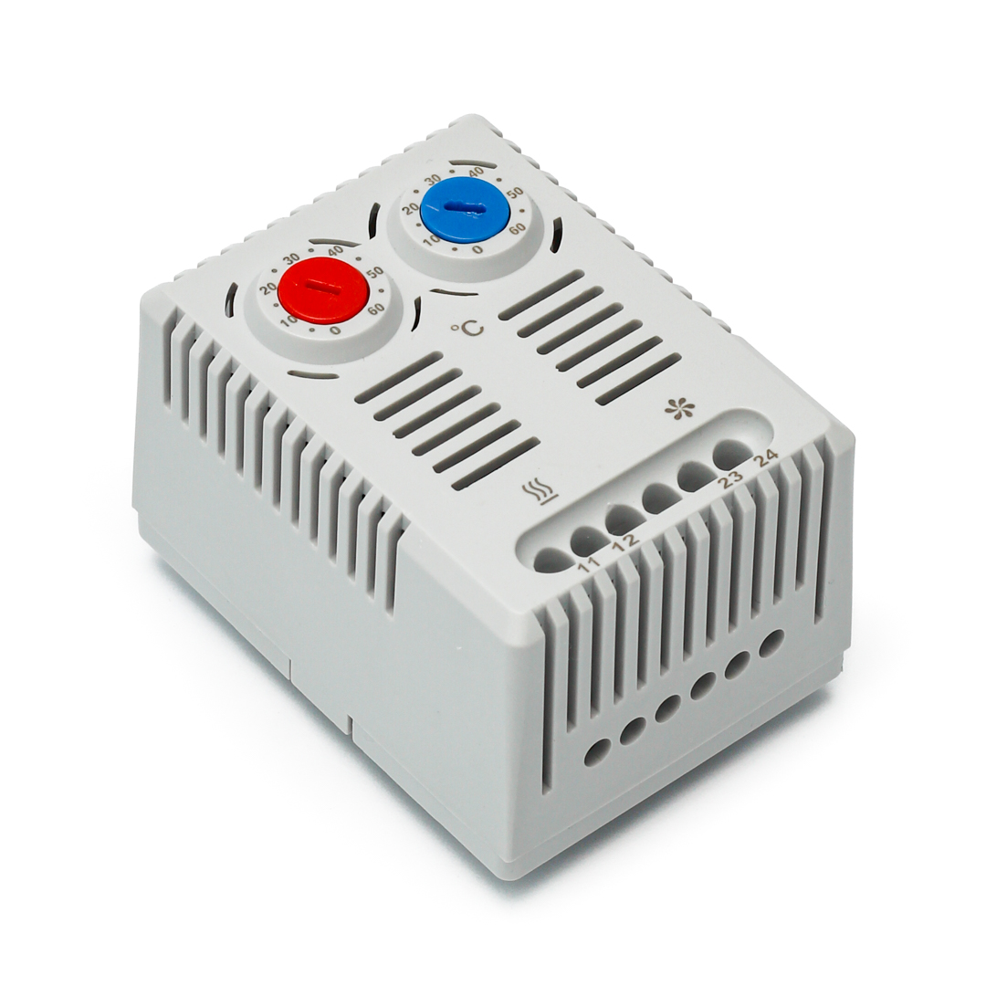 Предназначен для независимого включения и выключения нагревателей и вентиляторов в диапазоне температур от -10 до +50°C. Разность температур переключения 7 K, погрешность ± 4 К. Термостат NC регулирует нагреватели. Термостат NO регулирует вентиляторы с фильтром и сигнальные датчики при превышении температуры. Приборы нагрева и охлаждения могут быть включены независимо друг от друга. Терморегулятор имеет компактный пластиковый корпус IP20, серого цвета (В.Ш.Г.) 67 x 50 x 46 мм. Устанавливается на DIN-рейку 35 мм. Подсоединяется четырехполюсным зажимом. Предусмотрено использование жестких проводов 2,5 мм, многопроволочных с наконечником 1,5 мм. Максимальный момент затяжки зажима 0,5 Нм. Максимальная коммутационная способность AC 250В, 10(2)A; AC 120В, 15(2)A; DC 30 Вт.